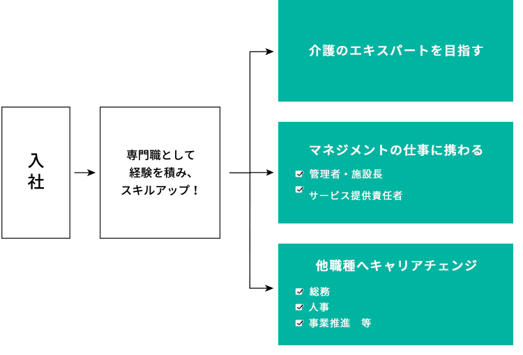 介護職を極めるもよし、新たな職種にチャレンジするもよし。がんばり次第で無限の可能性が広がります。