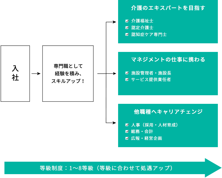 介護職を極めるもよし、新たな職種にチャレンジするもよし。がんばり次第で無限の可能性が広がります。
